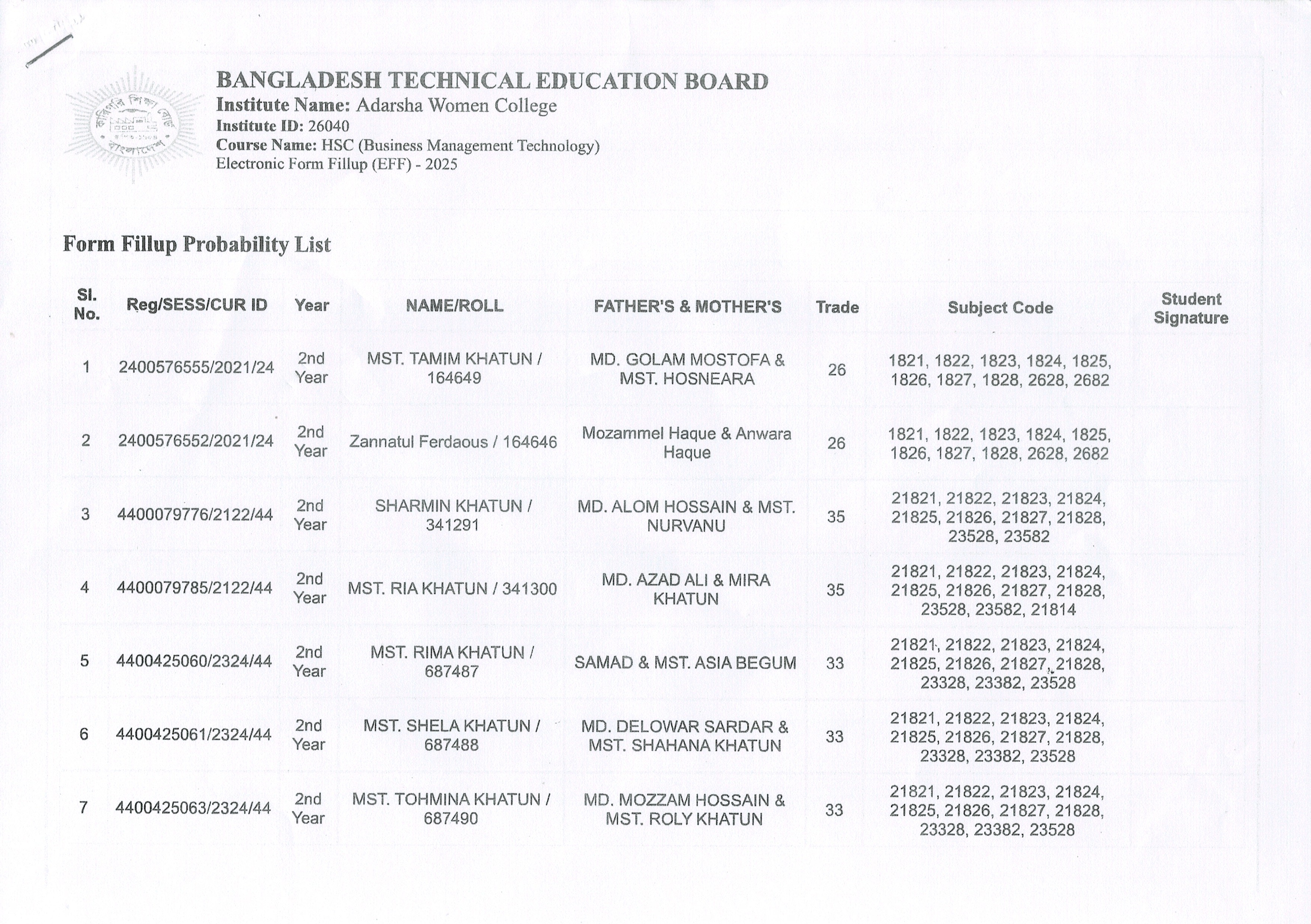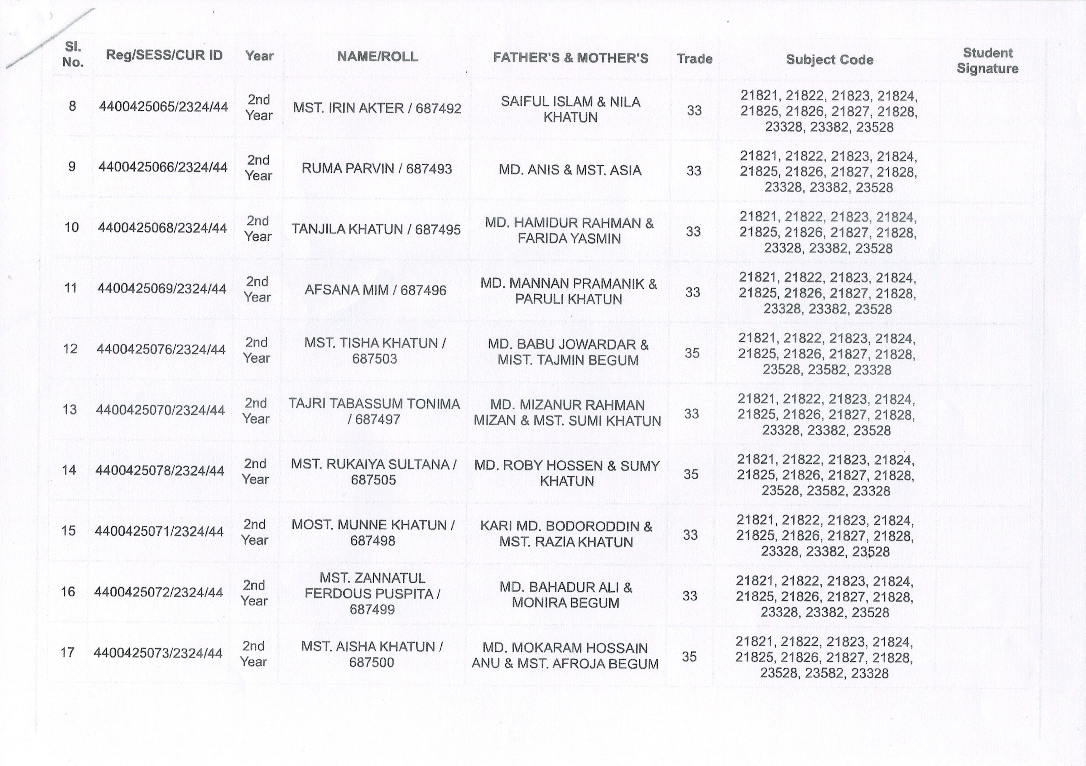শিক্ষার্থীদের তথ্য বিএম ২য় বর্ষ