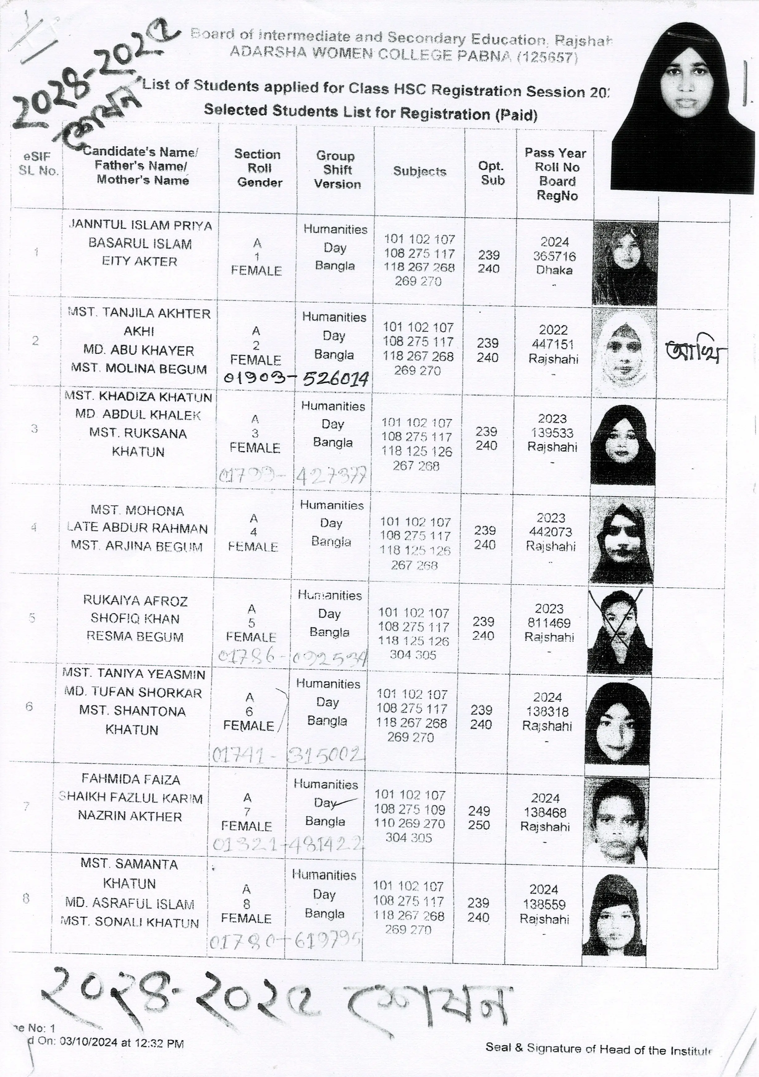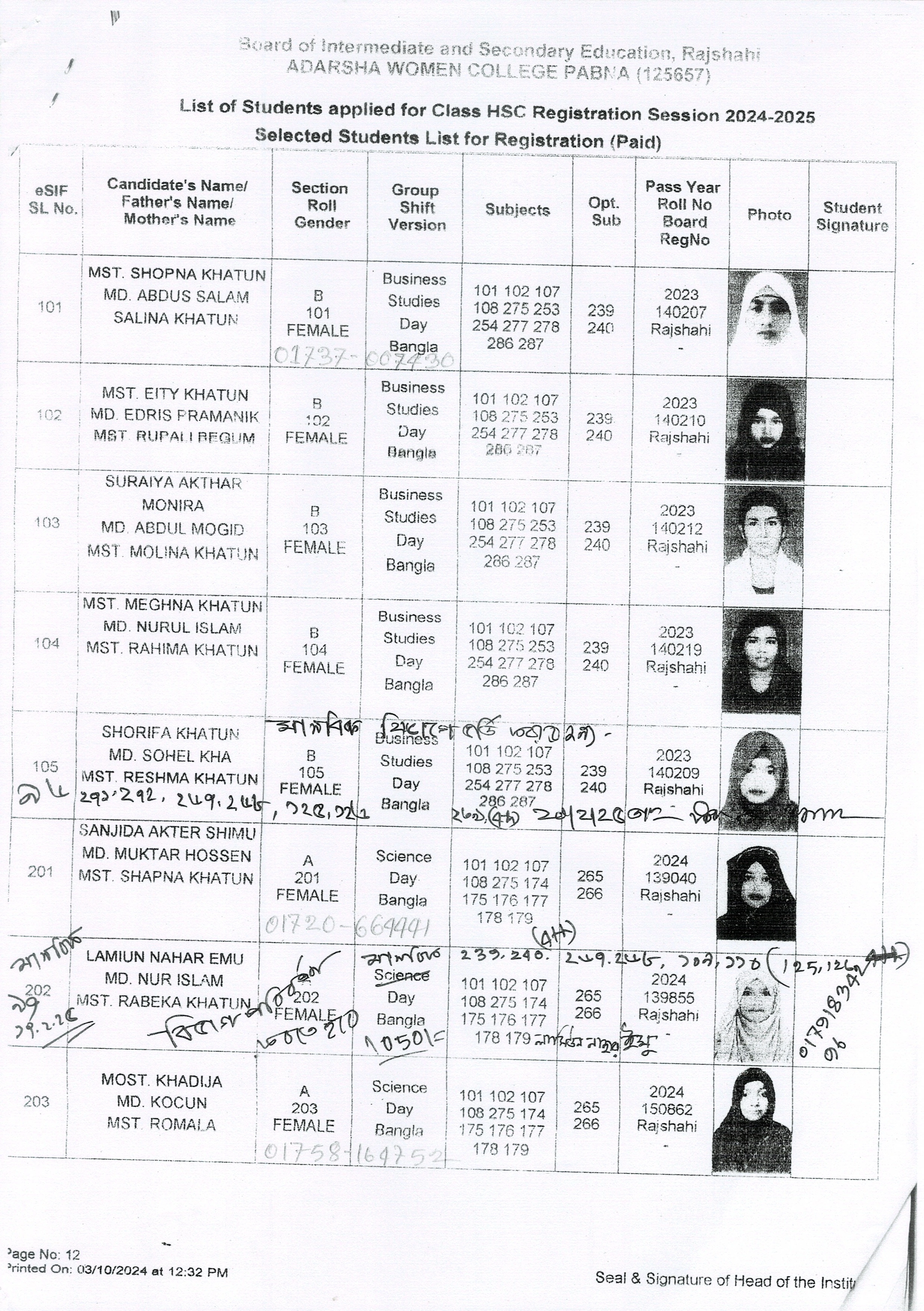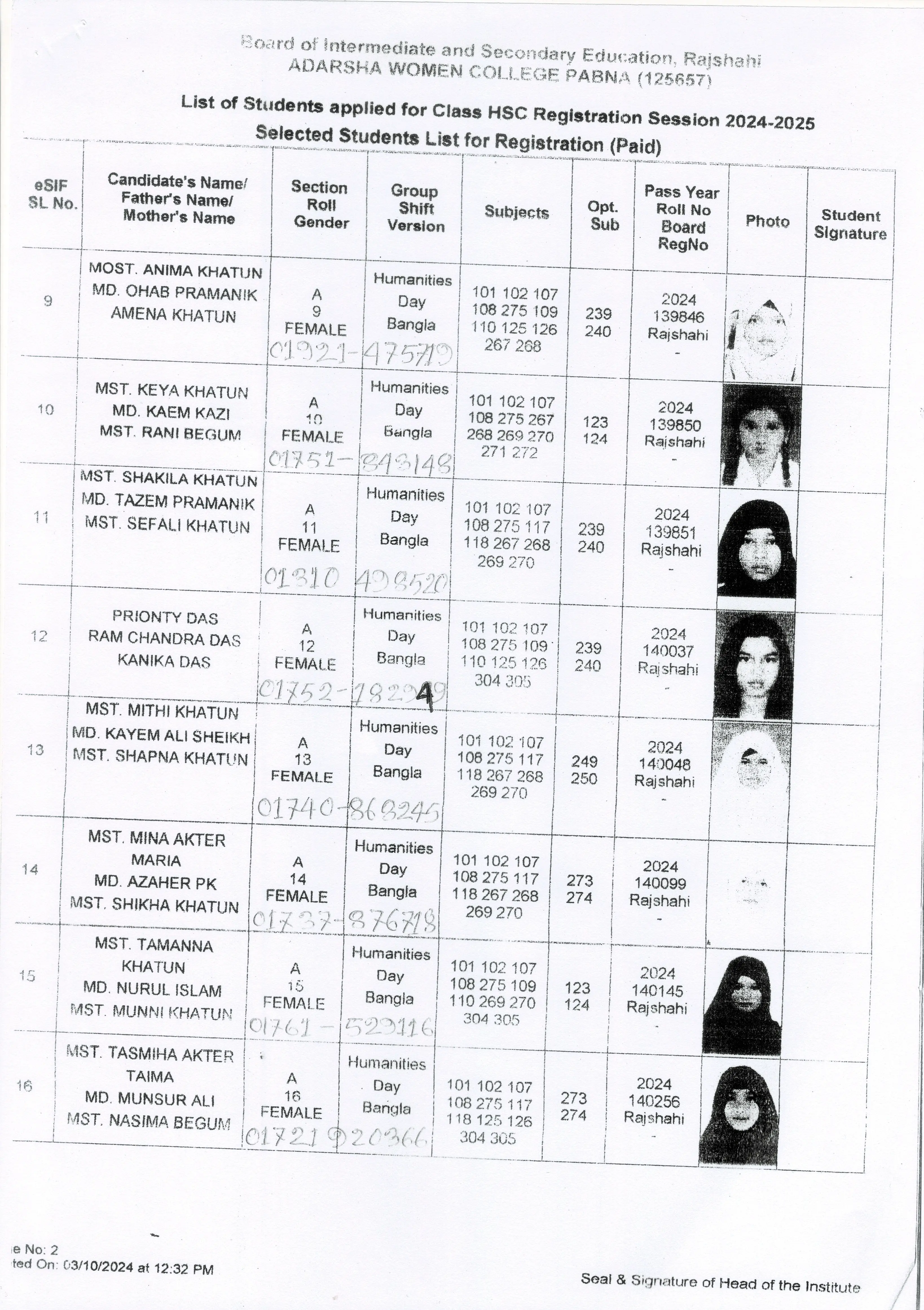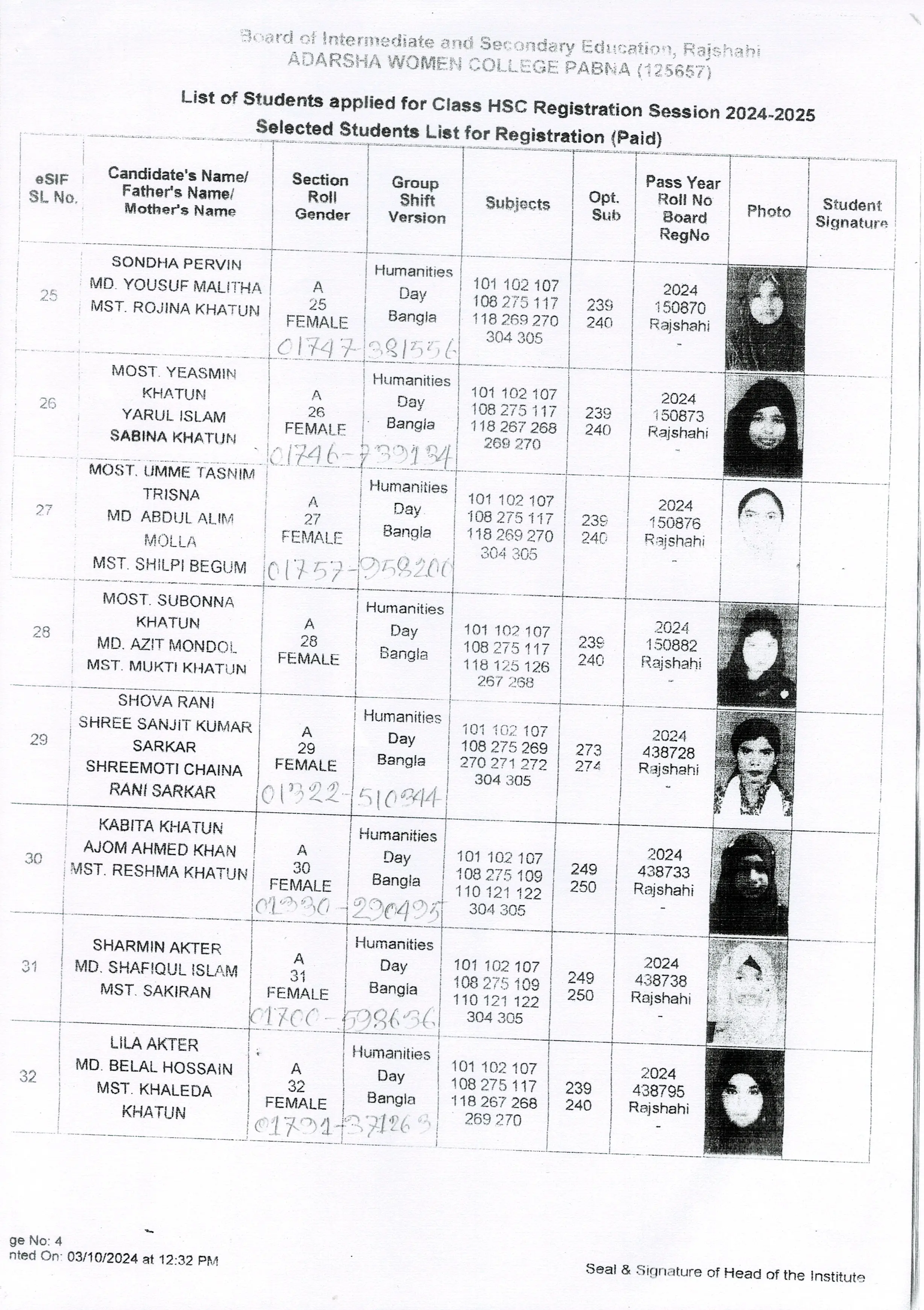 শিক্ষার্থীদের তথ্য সেশন ২০২৪-২০২৫