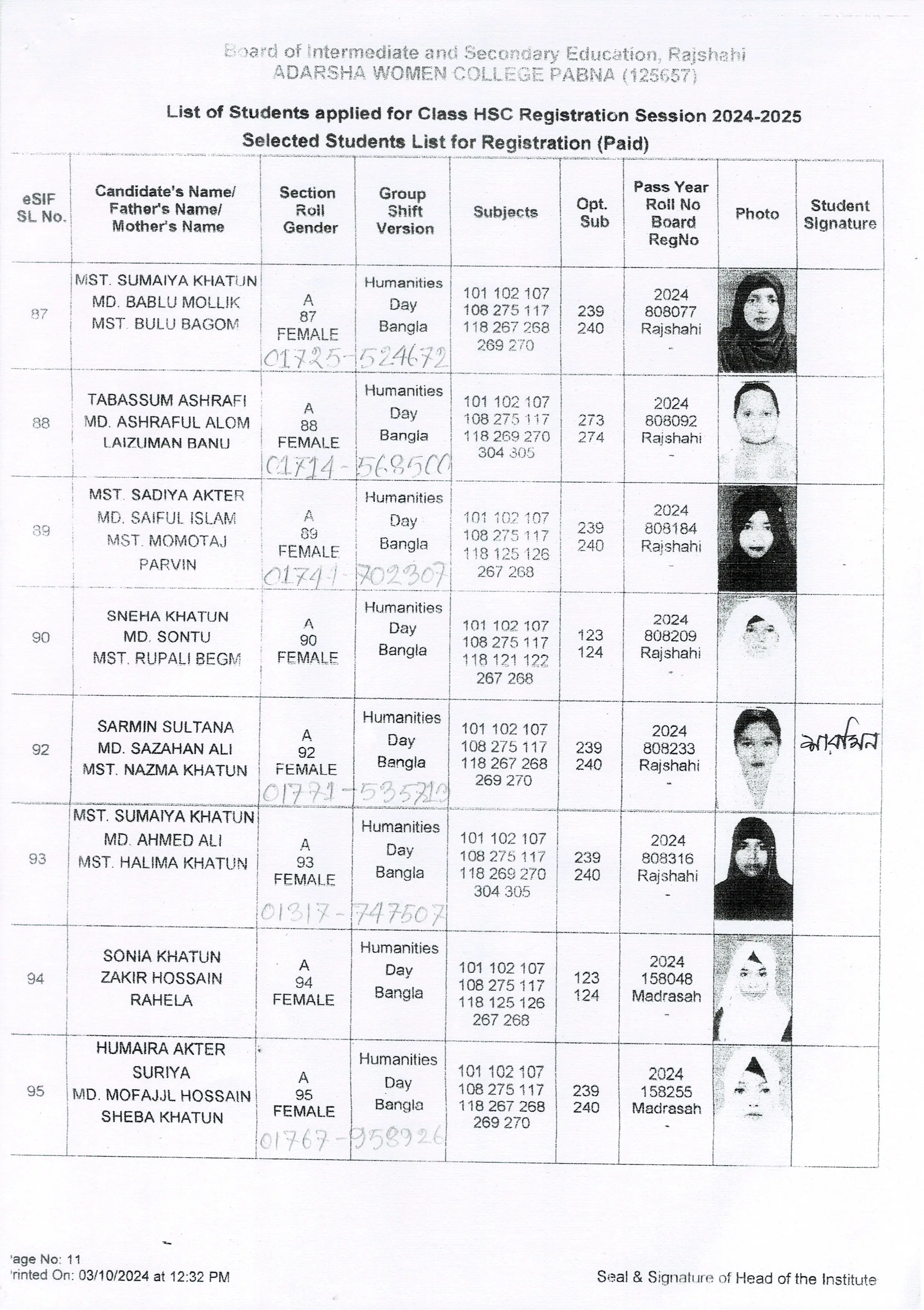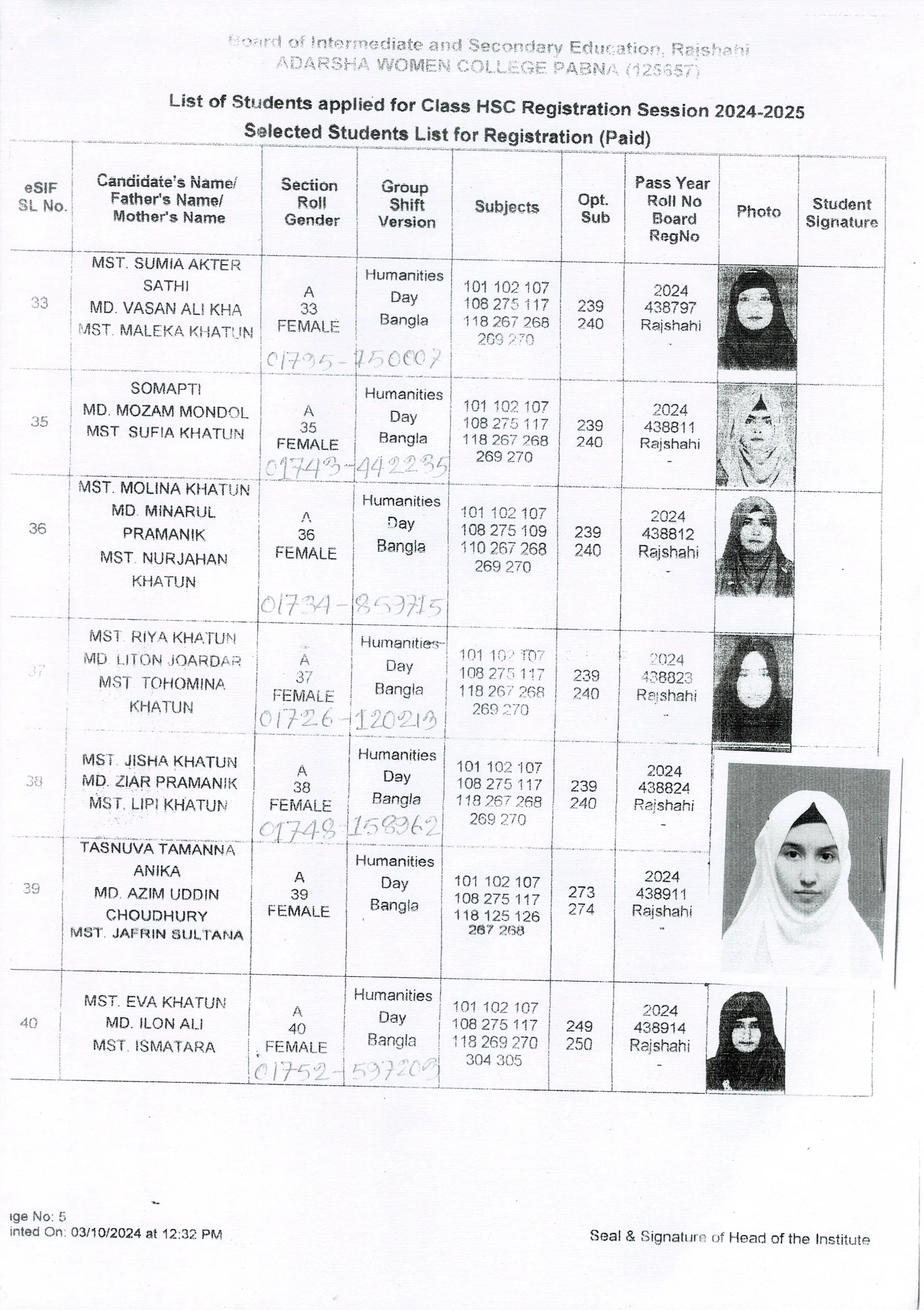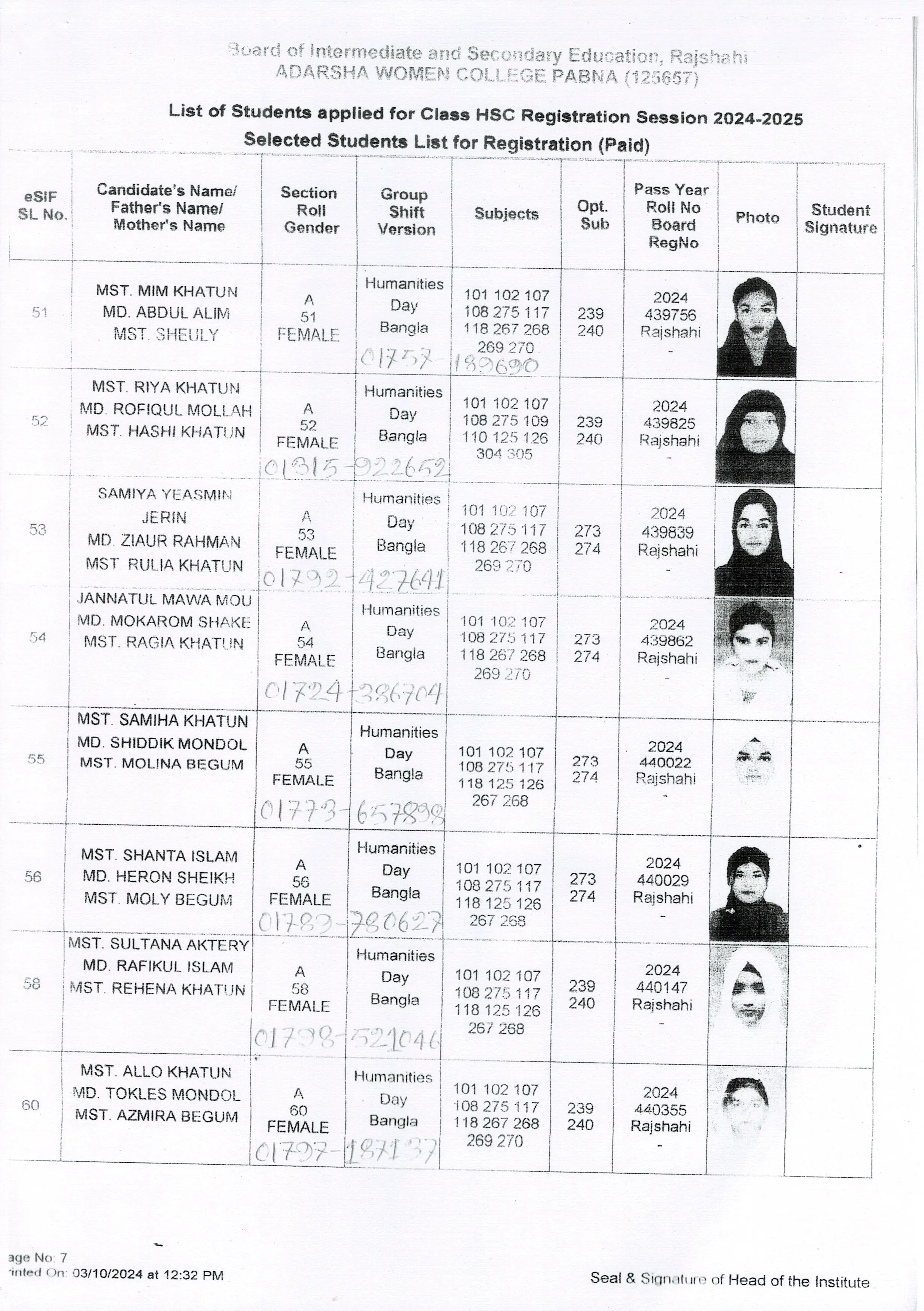 শিক্ষার্থীদের তথ্য সেশন ২০২৪-২০২৫
