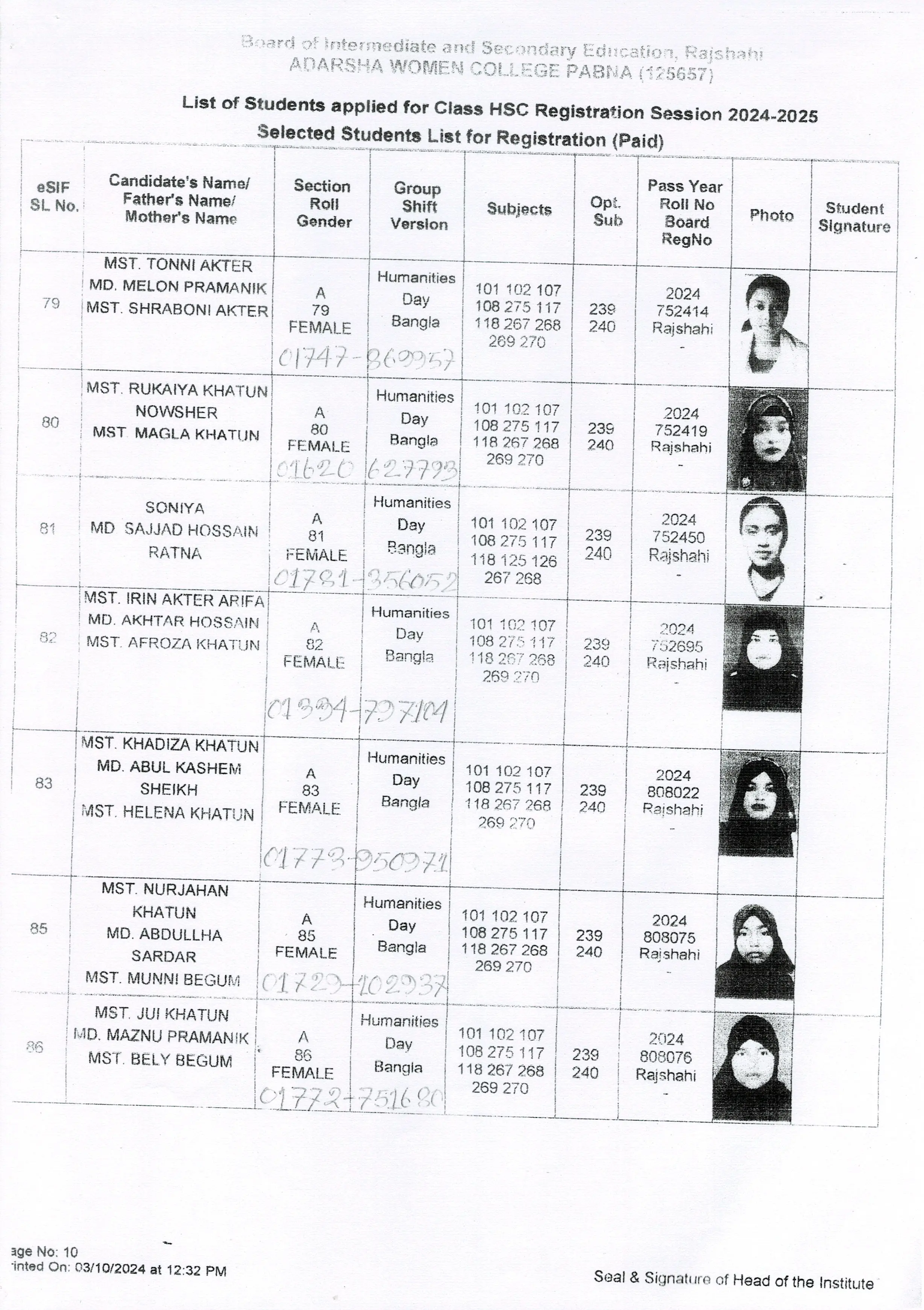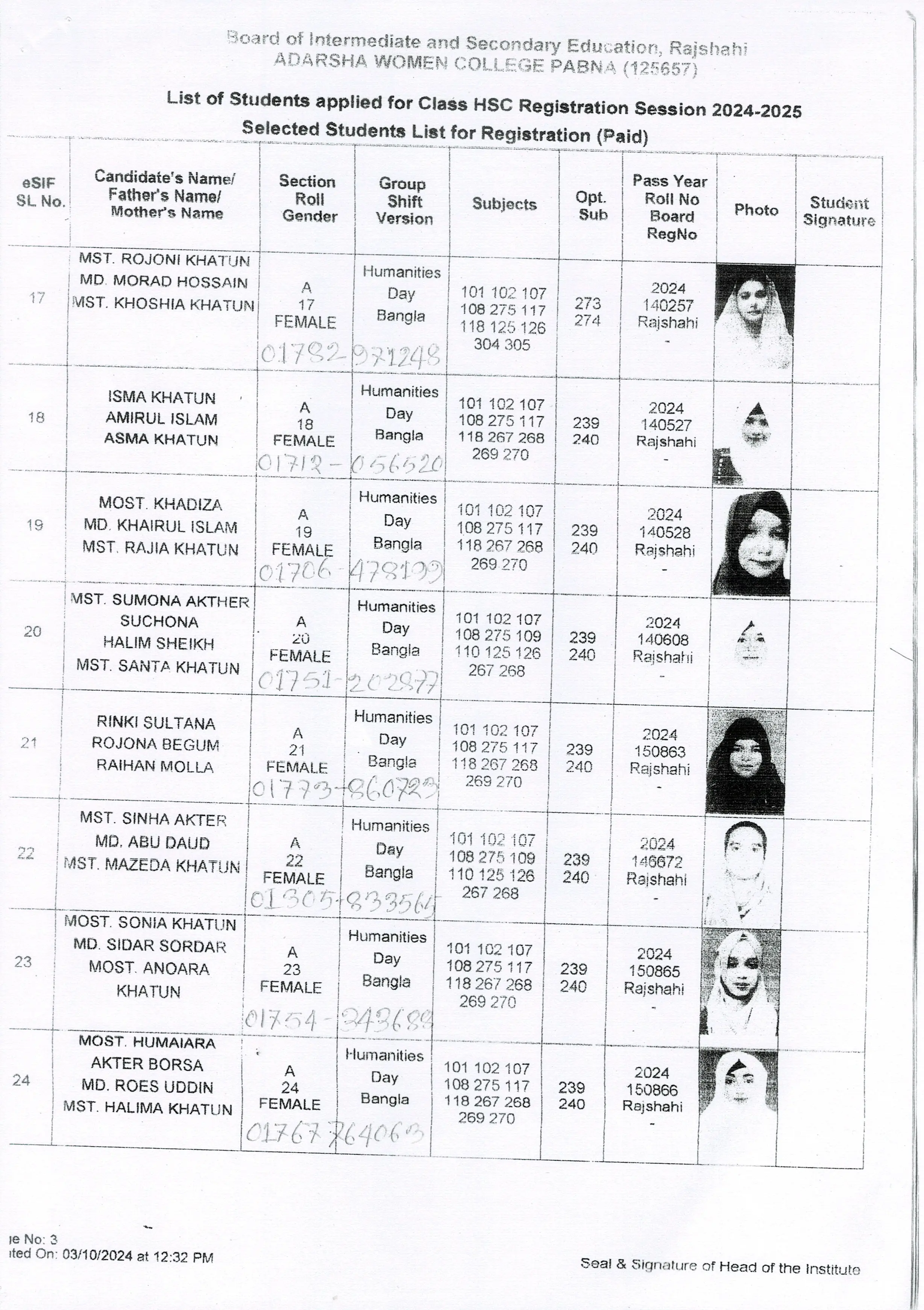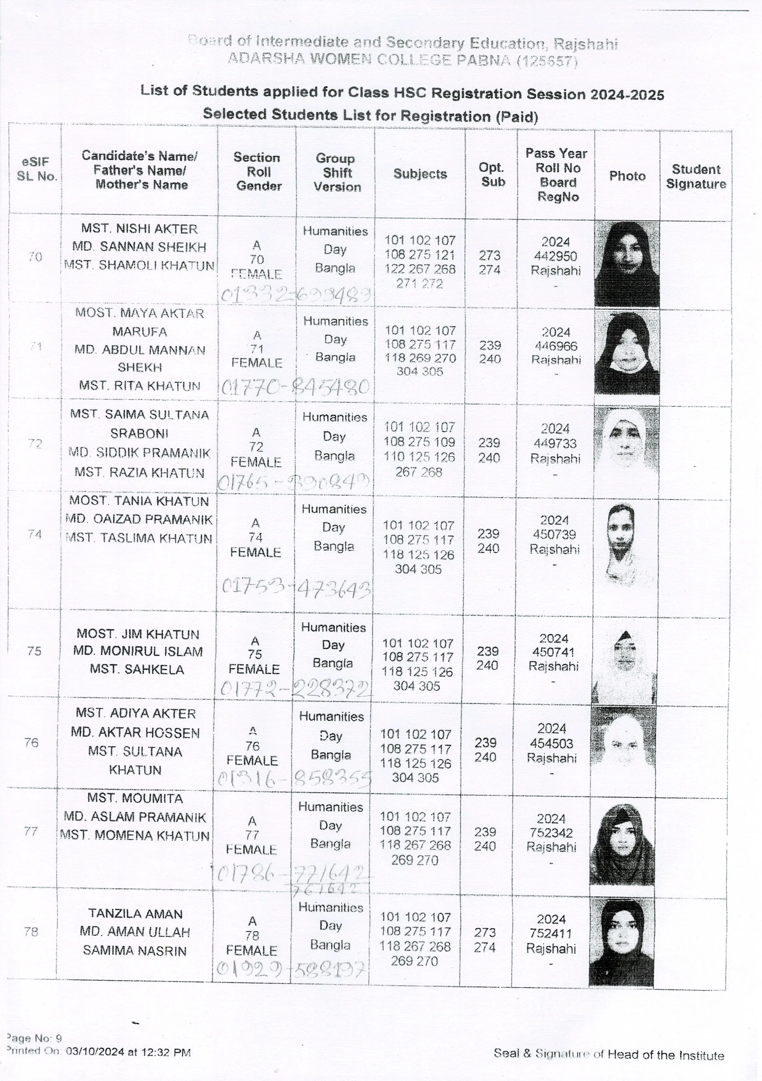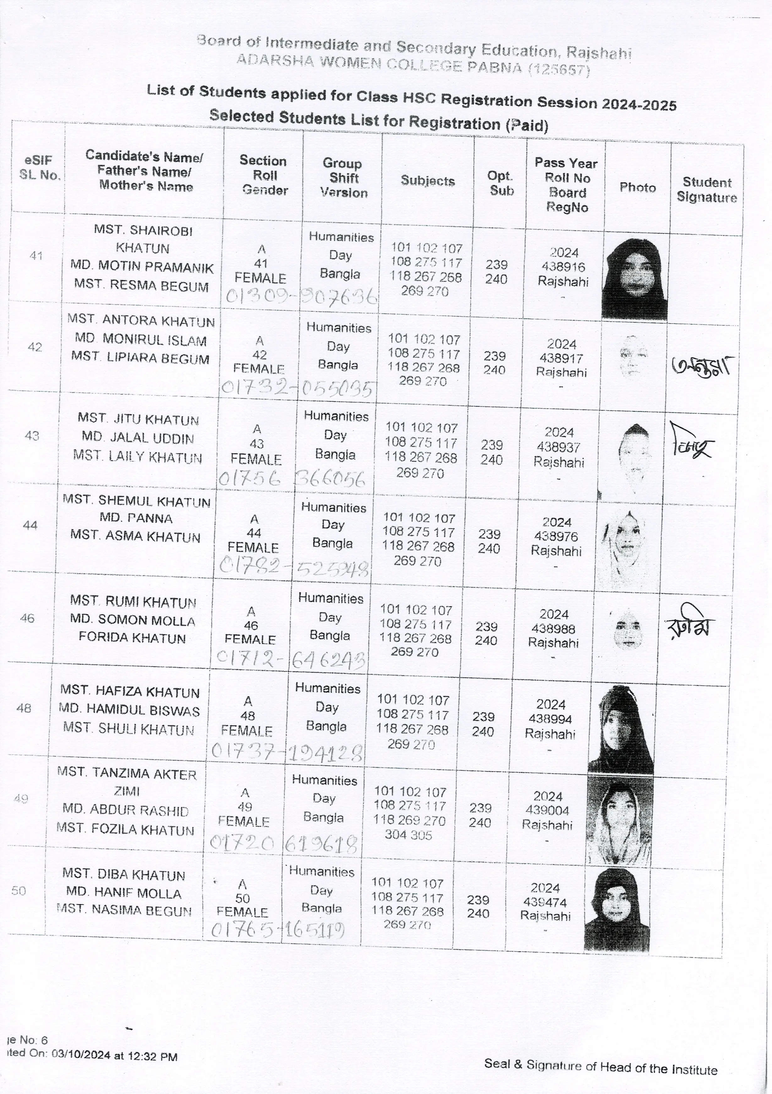 শিক্ষার্থীদের তথ্য সেশন ২০২৪-২০২৫